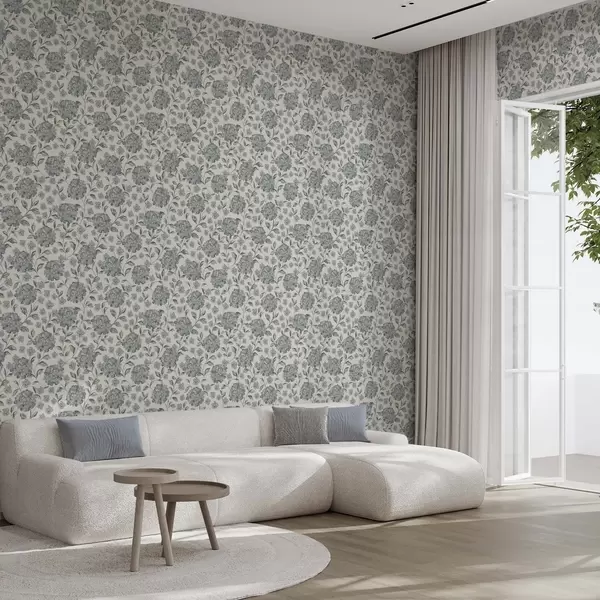 Tapet Flori și frunze stufoase într-o paletă de culori gri-albastru Nr. a00778