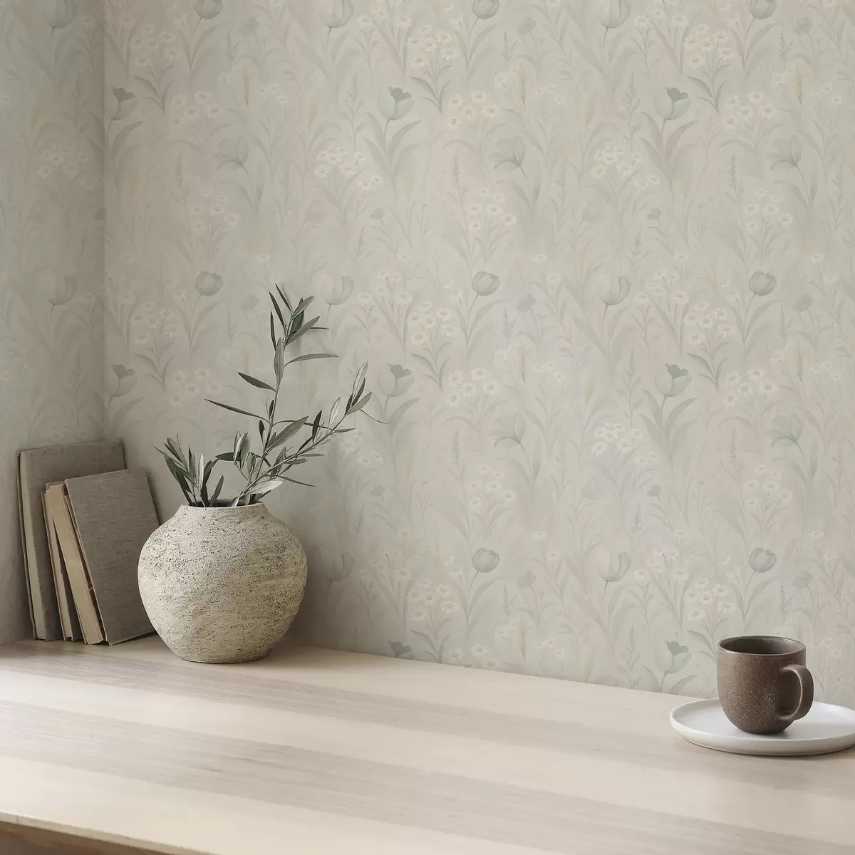 Tapet Pajiște delicată cu lalele și margarete, salvie pastelată Nr. a00779