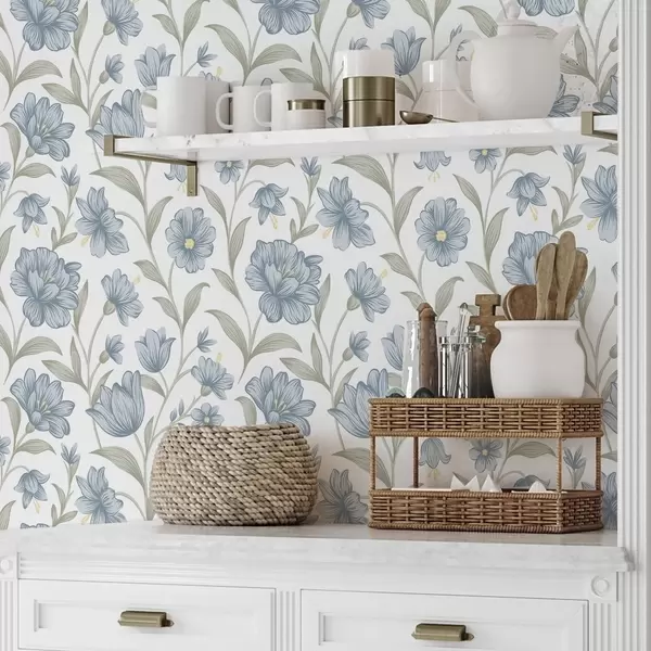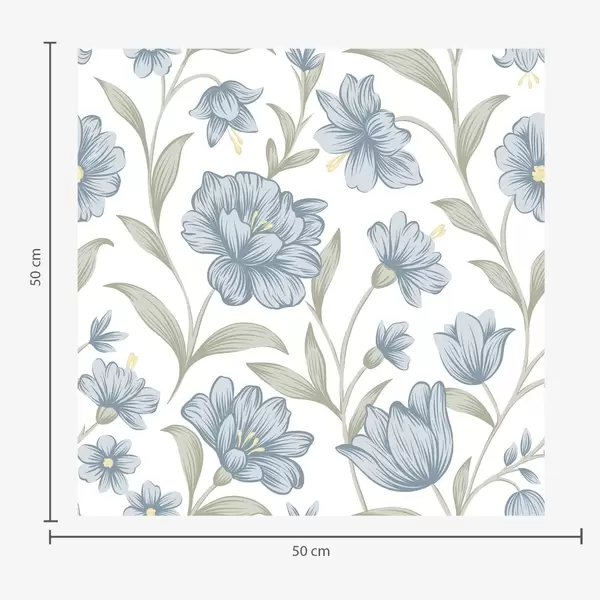 Tapet Flori albastre prăfuite cu frunze de măslin pe fond alb Nr. a00780