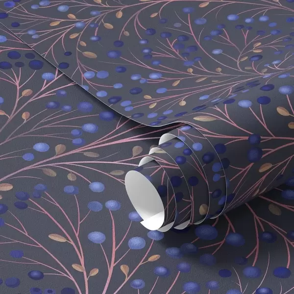 Wallpaper Ramuri roz-maronii și fructe de pădure albastre pe un fundal grafit a00787