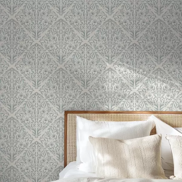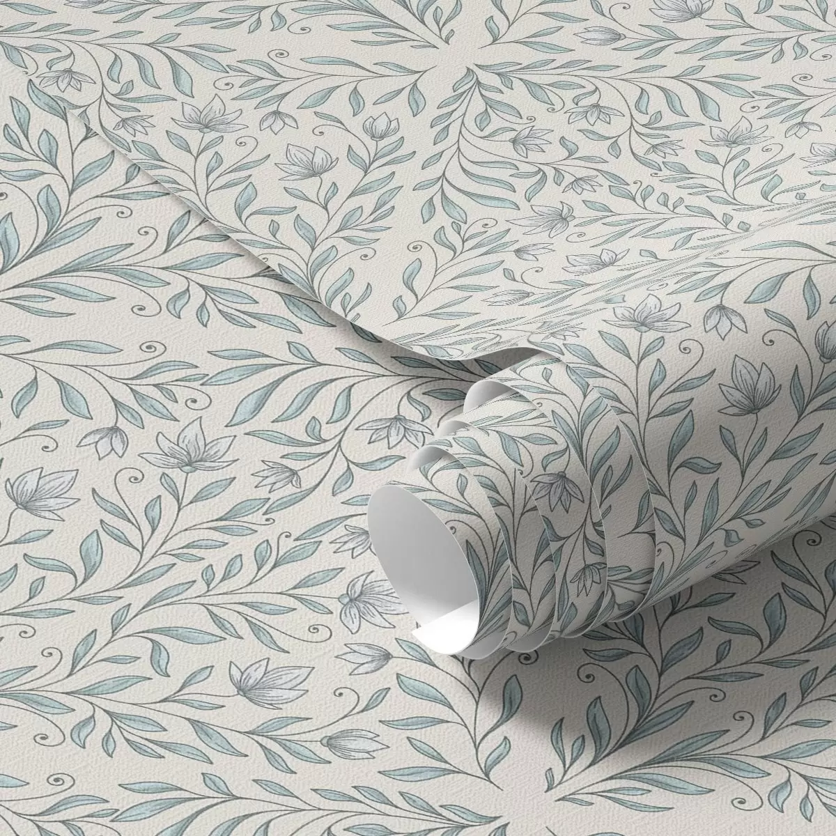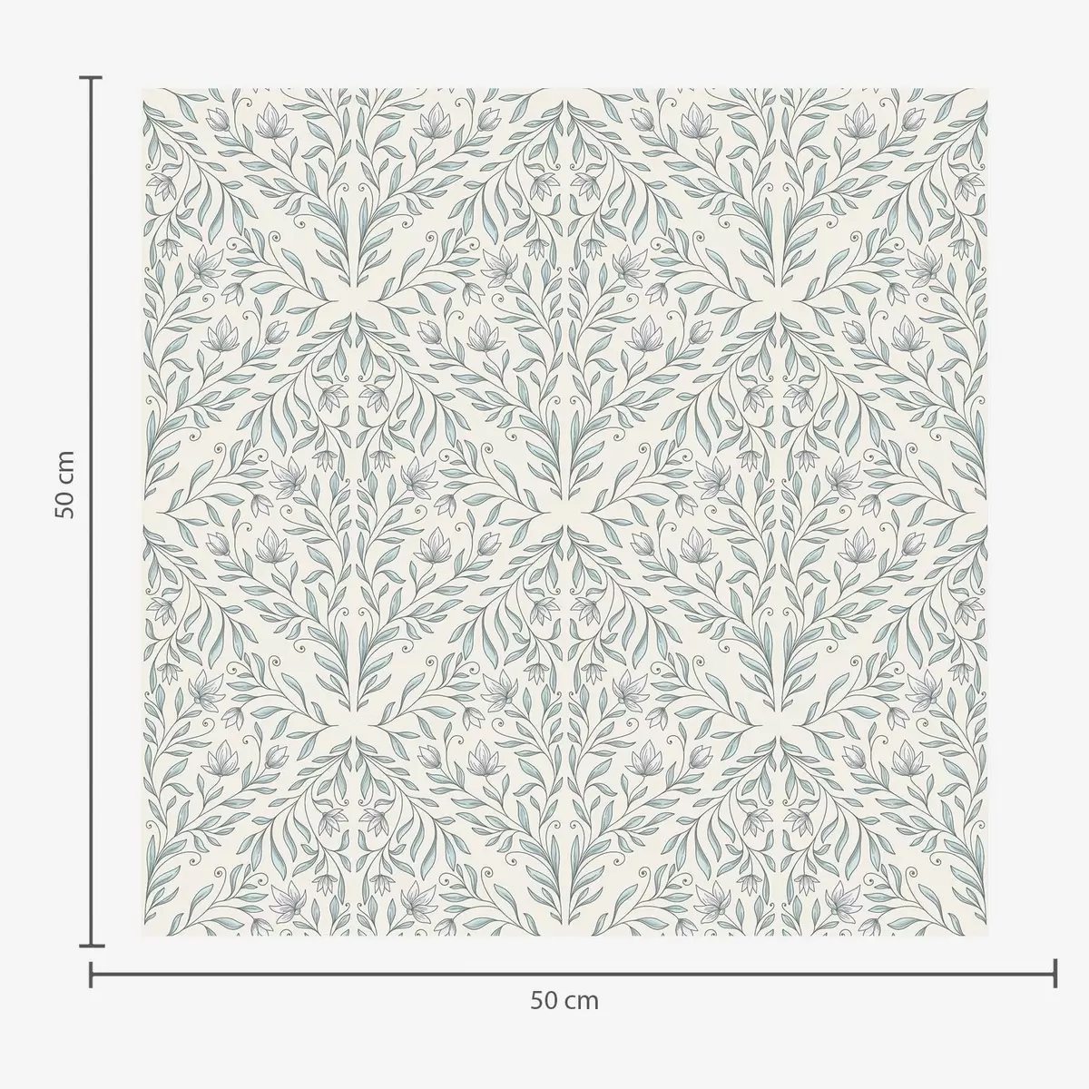 Tapet Lacy trage pe fond alb-crem cu contur turcoaz Nr. a00815v4