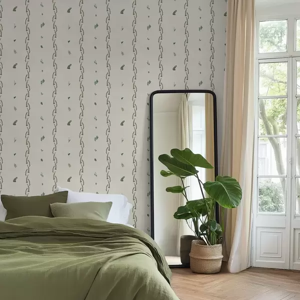 Tapet Lăstari verzi rari într-un ritm vertical, pe fond crem Nr. a00818