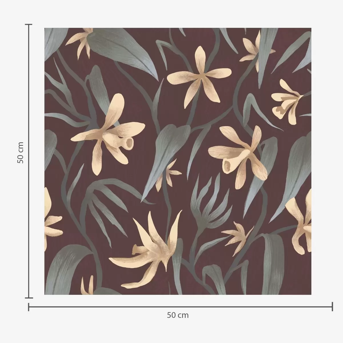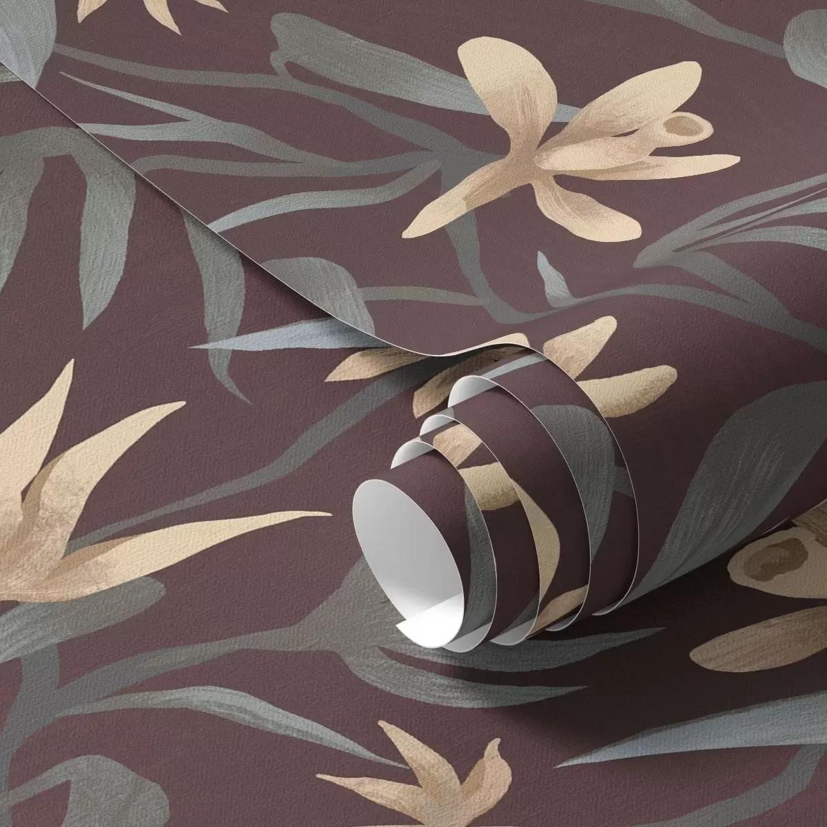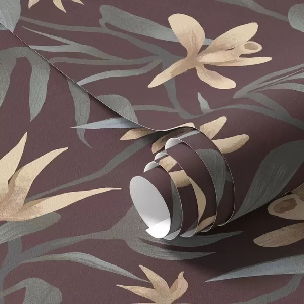 Wallpaper Flori crem cu frunze gri pe fond burgund a00833