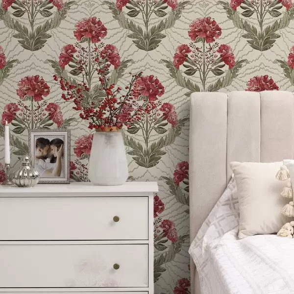 Tapet Bujori mari roșii pe fundal grafic, pe fond crem Nr. a00857
