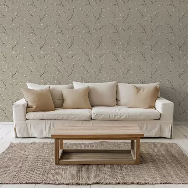 Tapet Crenguțe cu muguri albi pe fundal de culoare gri-bej Nr. a00861