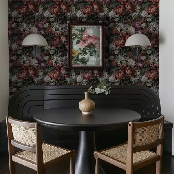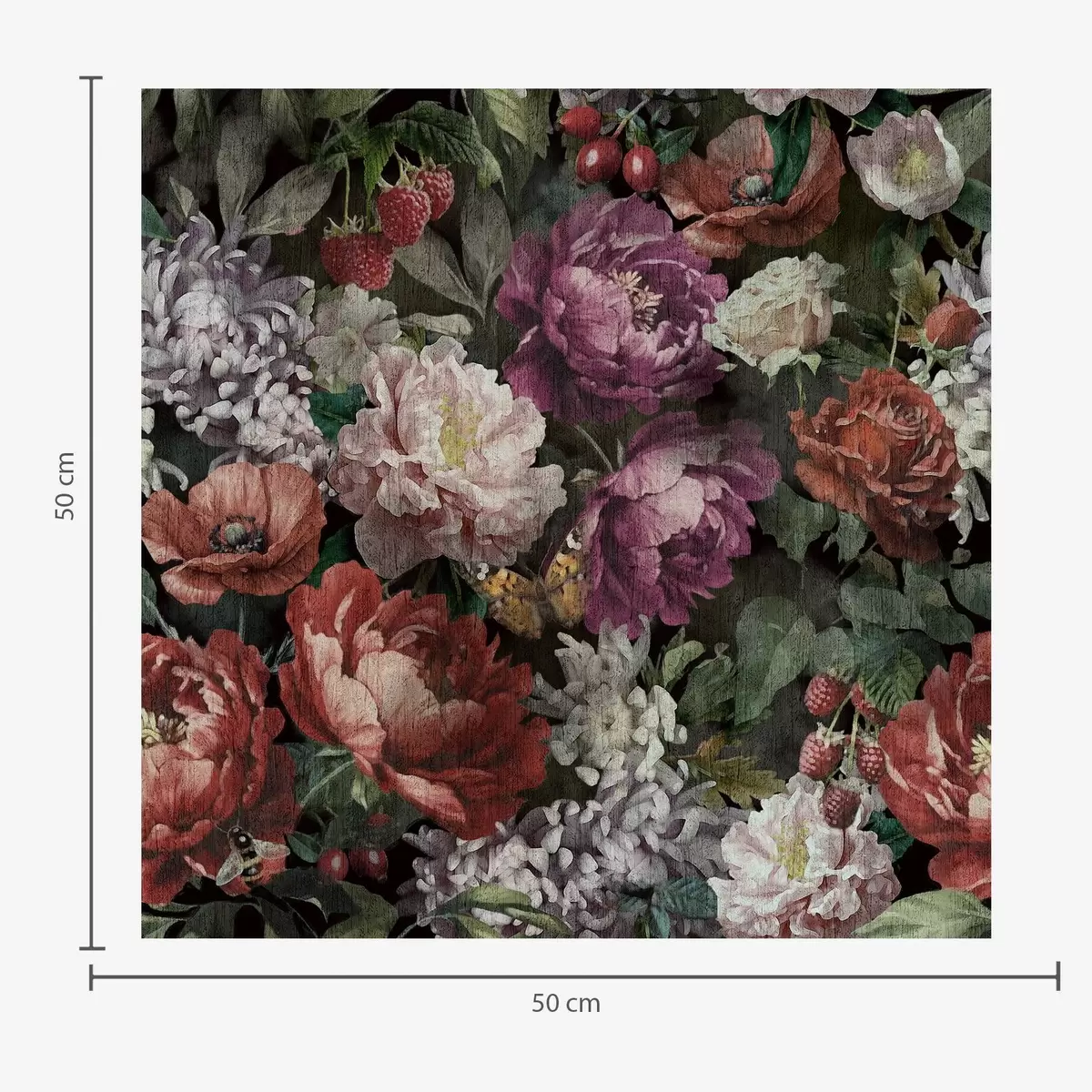 Tapet Bujori dramatici întunecați, fructe de pădure și fluture pe fond negru Nr. a00862