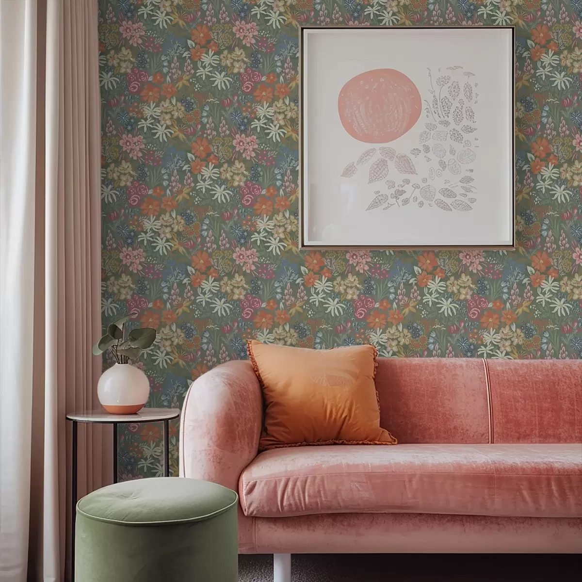 Tapet Flori de câmp pictate pe fond verde salvie Nr. a00864
