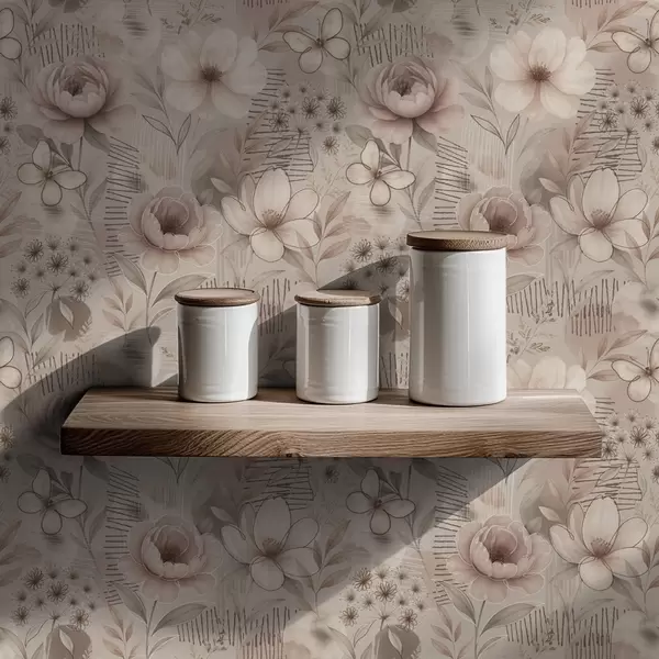Tapet Florale bej sepia cu accente de fluturi și linii Nr. a00870