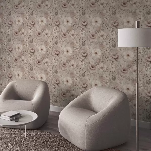 Tapet Florale bej sepia cu accente de fluturi și linii Nr. a00870