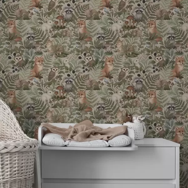 Wallpaper Animale din pădure, ferigi și ciuperci pe fond bej deschis a00880v1
