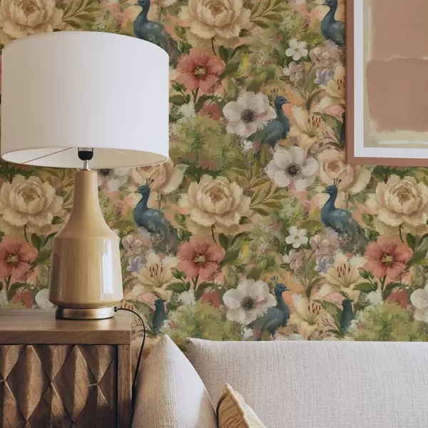 Tapet Grădină picturală cu păuni și flori mari Nr. a00885