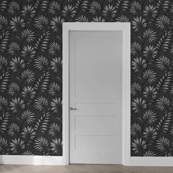 Wallpaper Frunze de palmier alb-negru pe fundal întunecat a00891