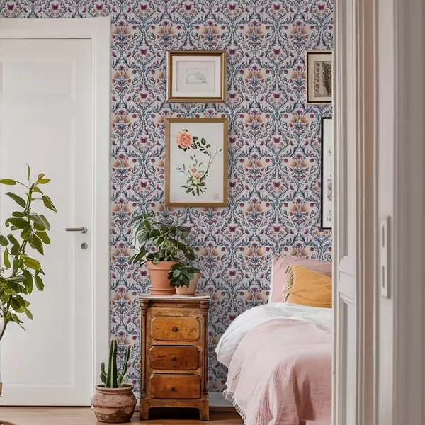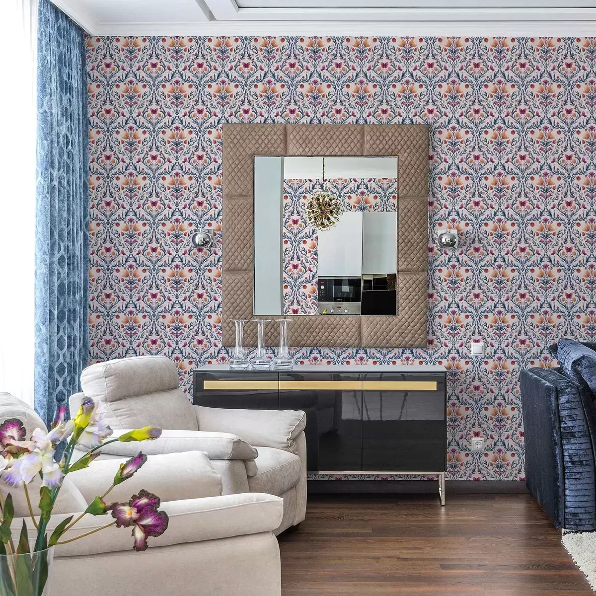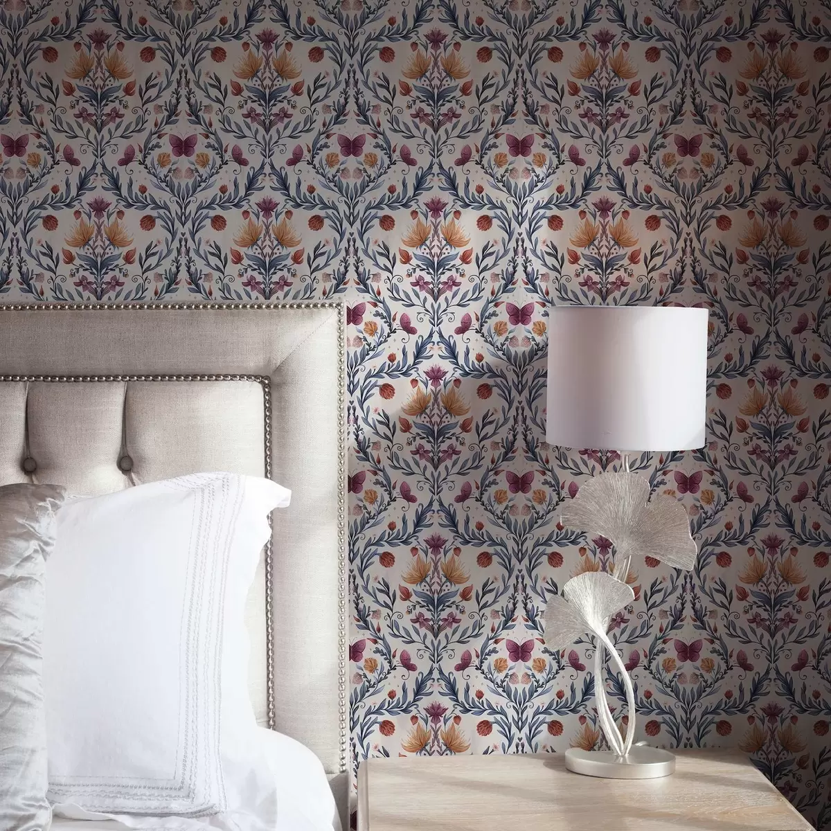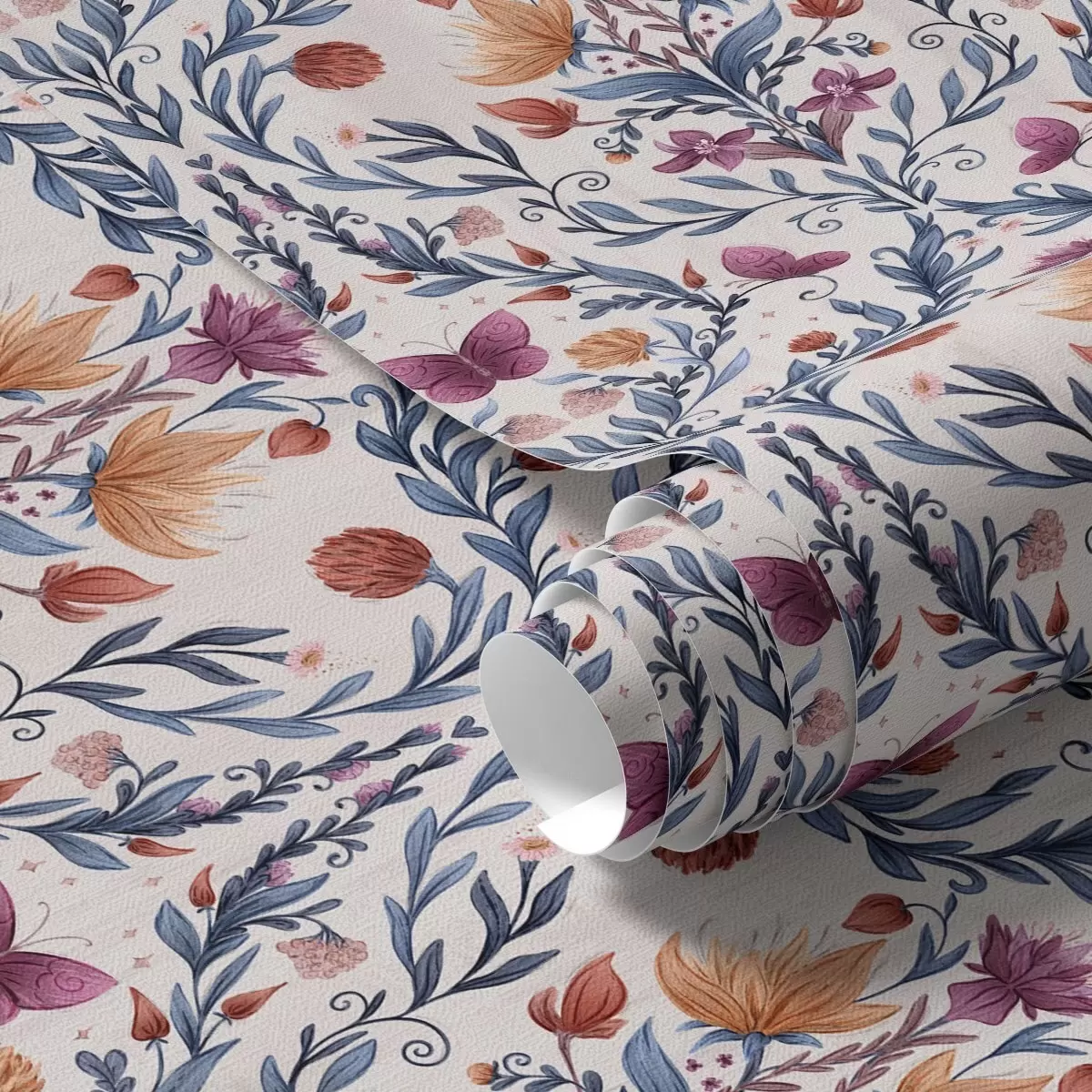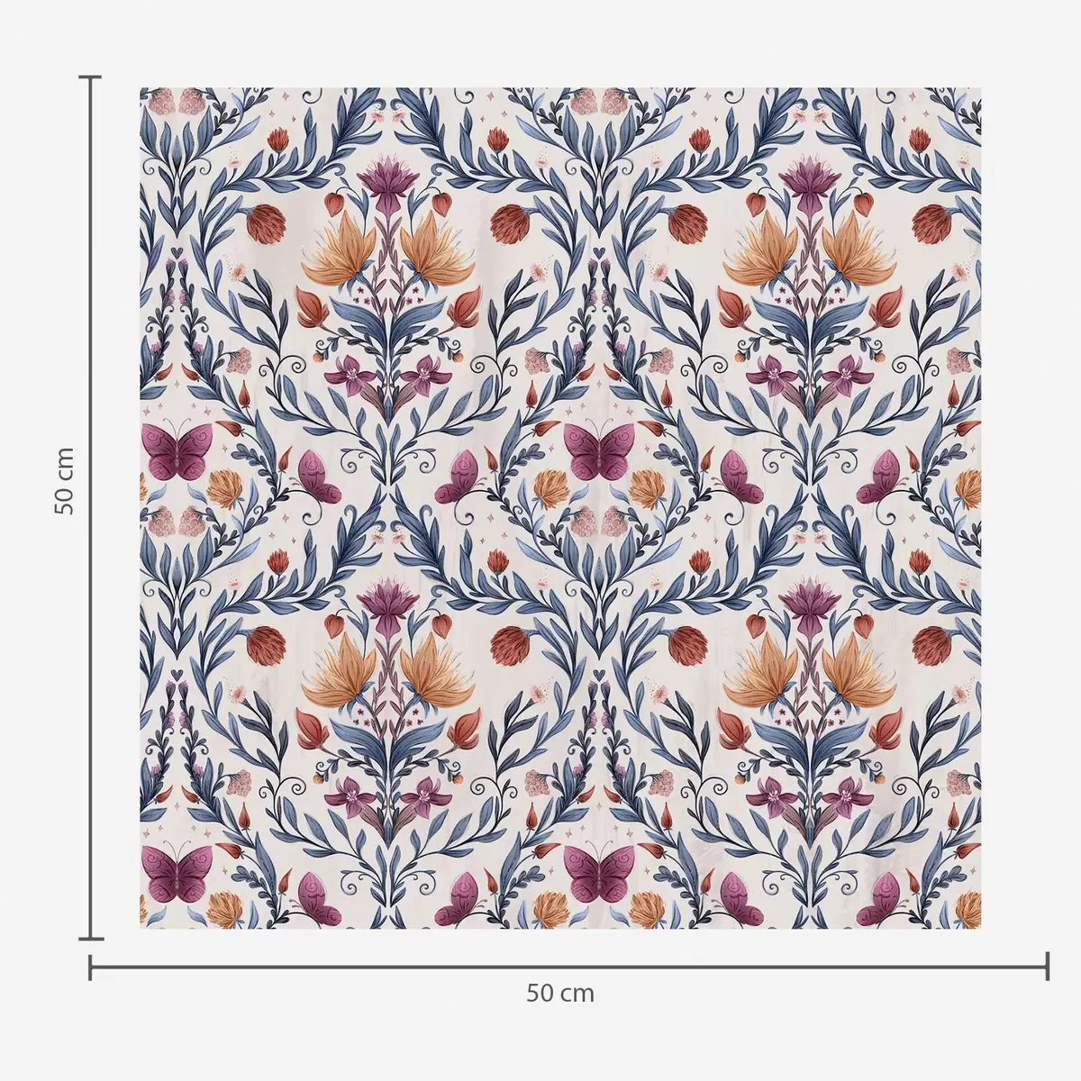 Tapet Damasc floral cu fluturi în albastru închis și teracotă pe fond alb Nr. a00926v1