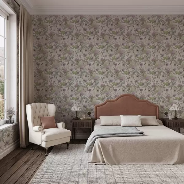 Wallpaper Flori sălbatice de liliac și frunze pe un fundal pudrat a00930v3