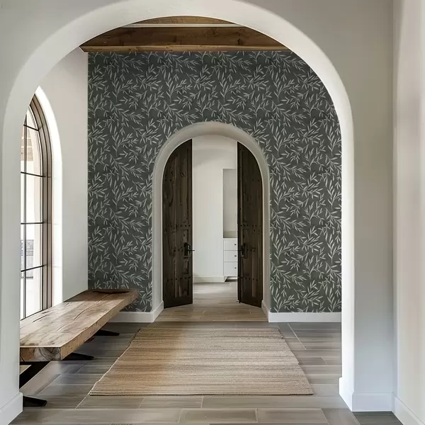 Wallpaper Ramuri albe schițate pe un fundal verde salvie intens a00936v2