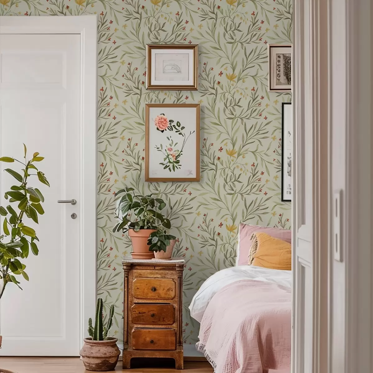 Tapet Flori galbene și roșii pe un fundal verde deschis Nr. a00937