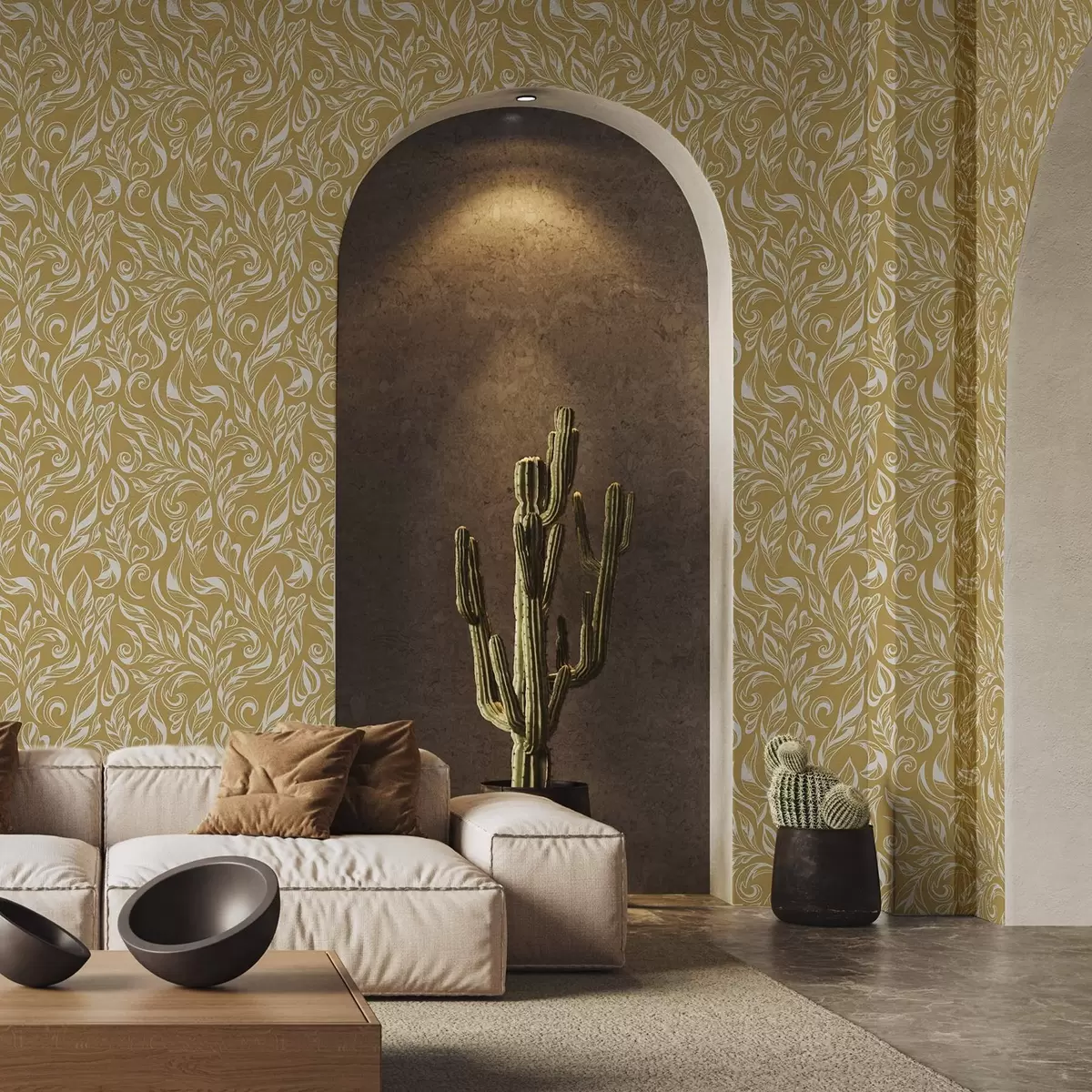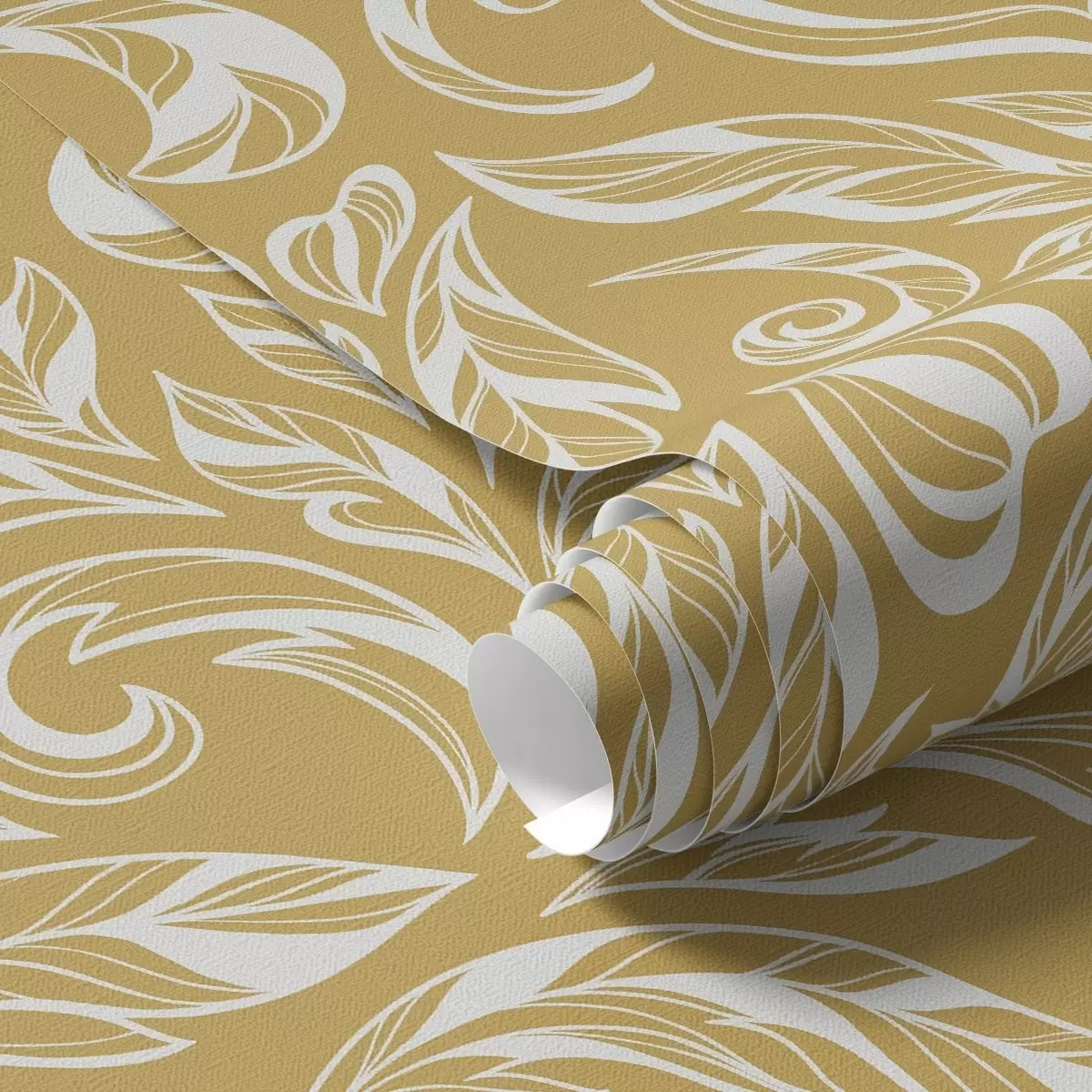 Tapet Ornament frunziș alb-crem pe un fundal ocru cald Nr. a00940v1