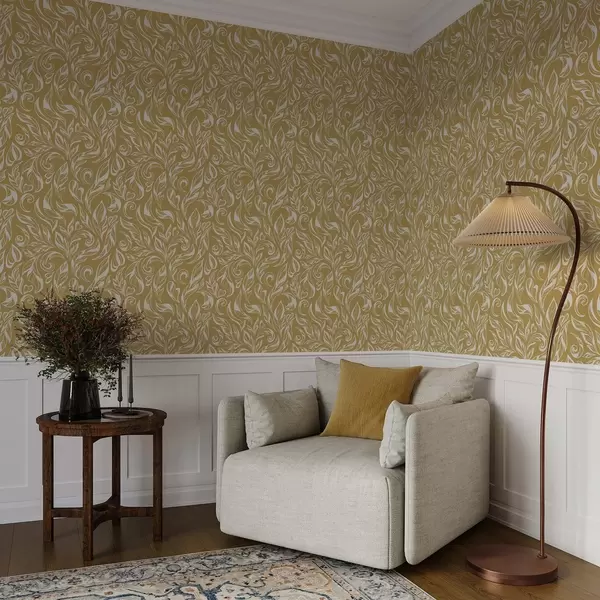 Tapet Ornament frunziș alb-crem pe un fundal ocru cald Nr. a00940v1