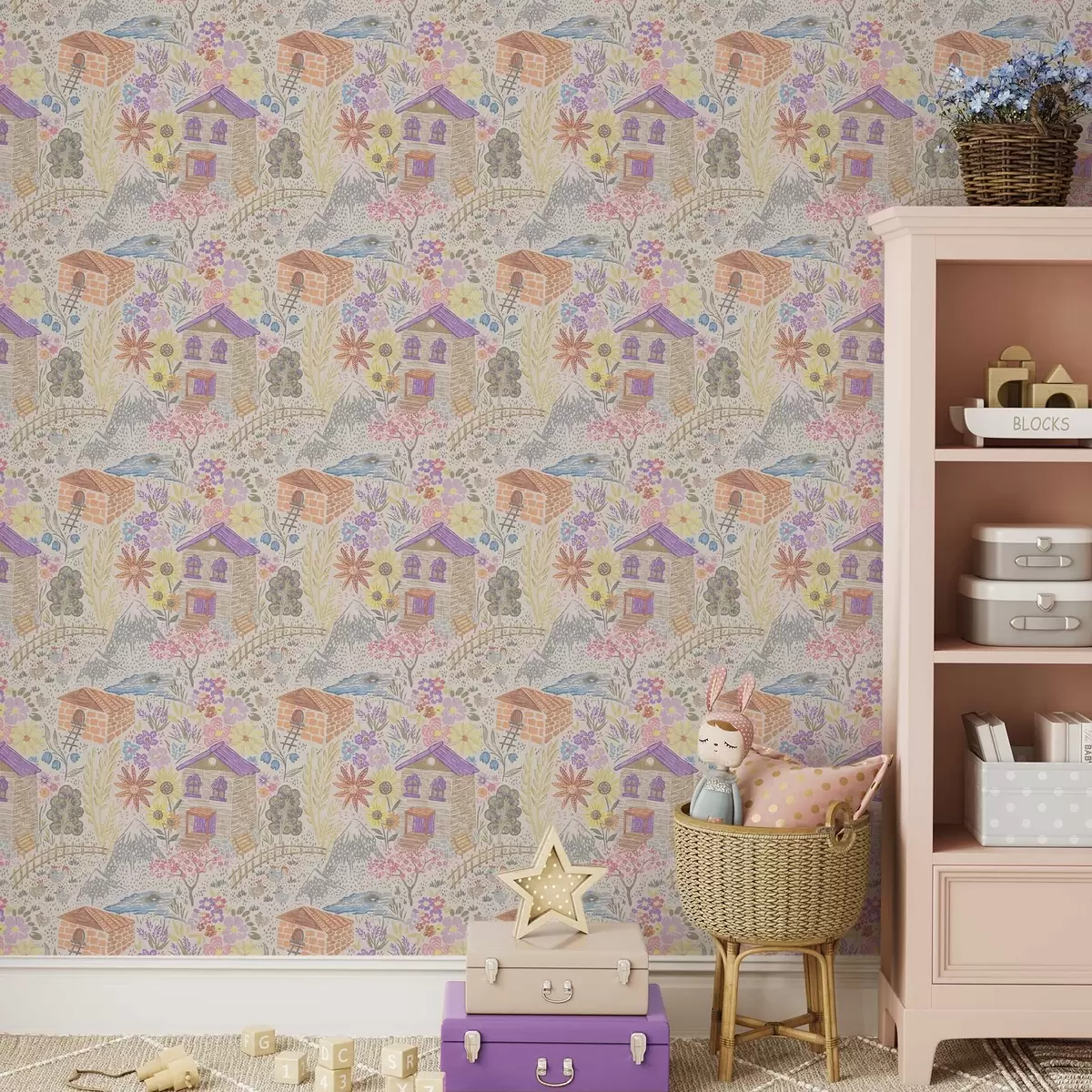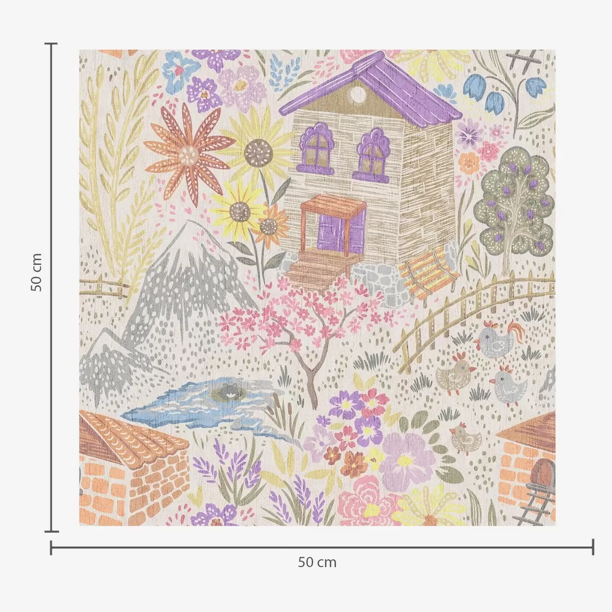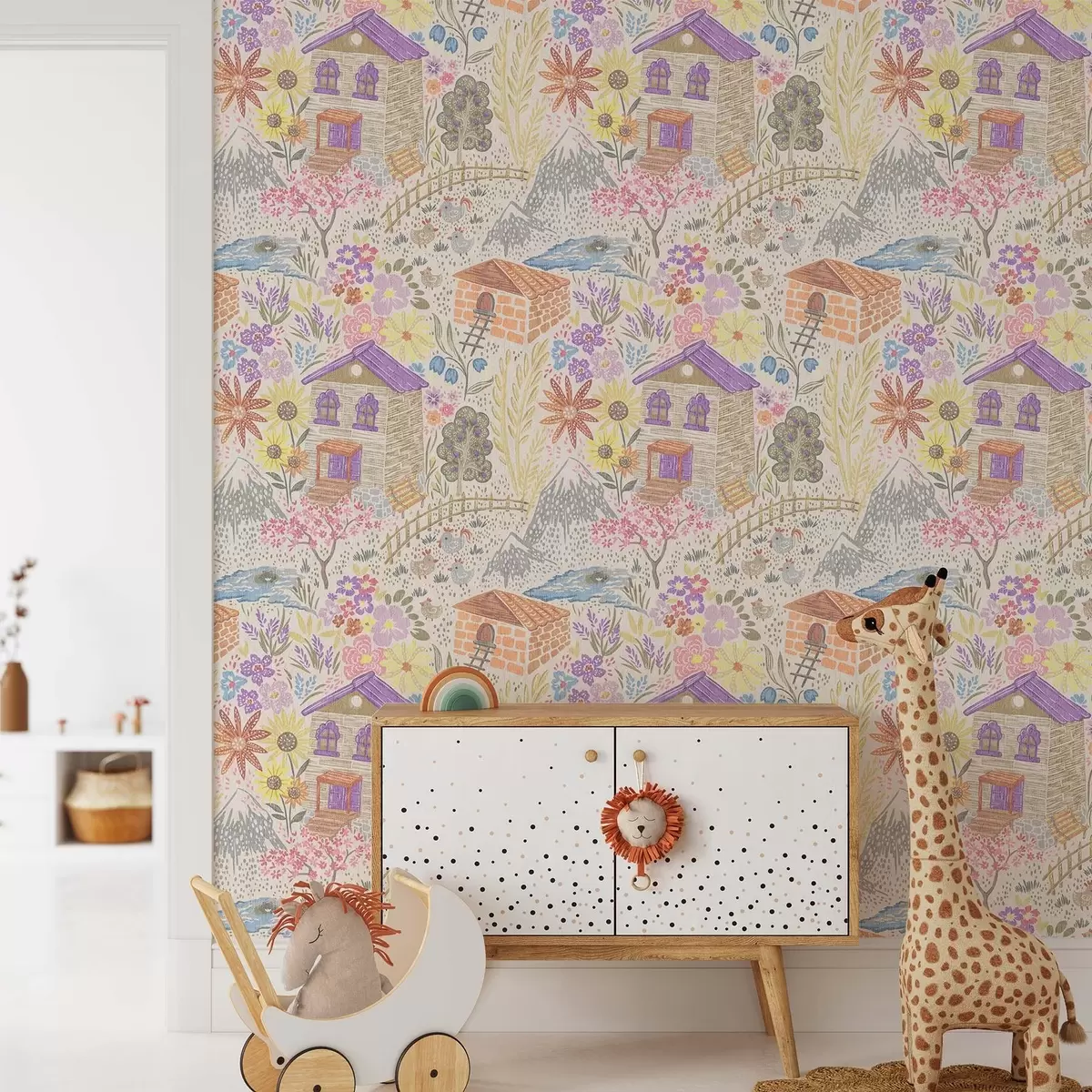 Tapet Desen copilăresc cu o casă, munți și flori Nr. a00952