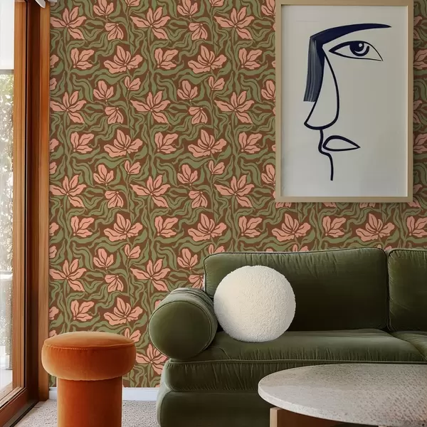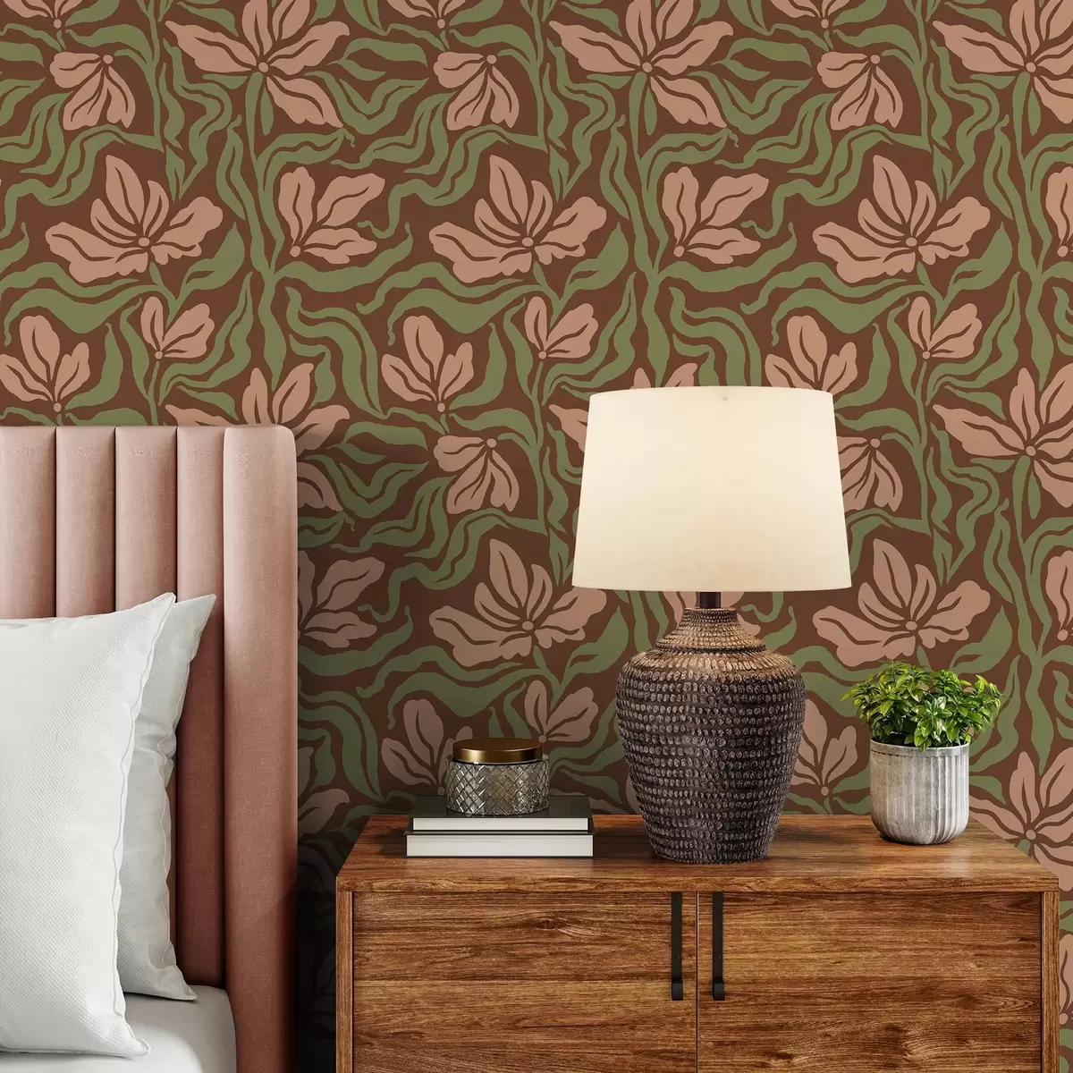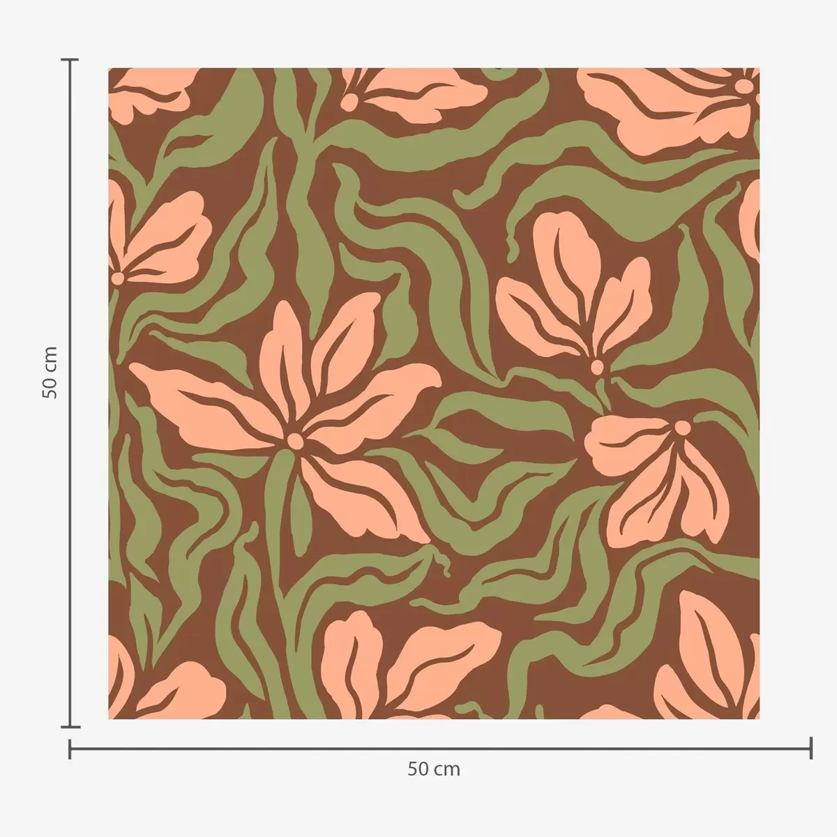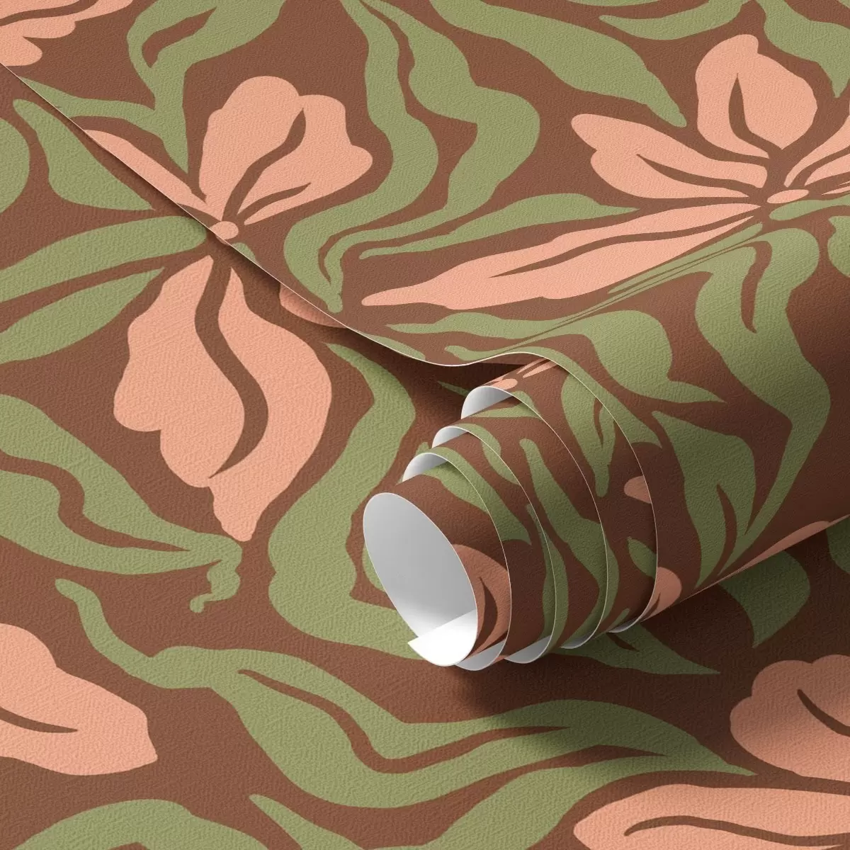 Tapet Flori de piersic și verdeață pe un fundal maro închis Nr. a00958v2