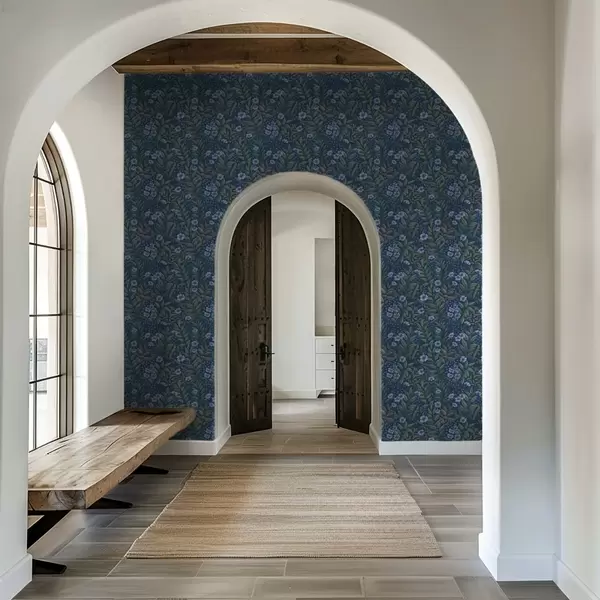 Tapet Boabe albastre-închis și flori albe în frunzișul dens Nr. a00994