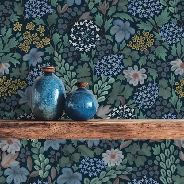Tapet Grădină nocturnă cu crini albaștri, fructe de pădure și verdeață sălbatică Nr. a00996