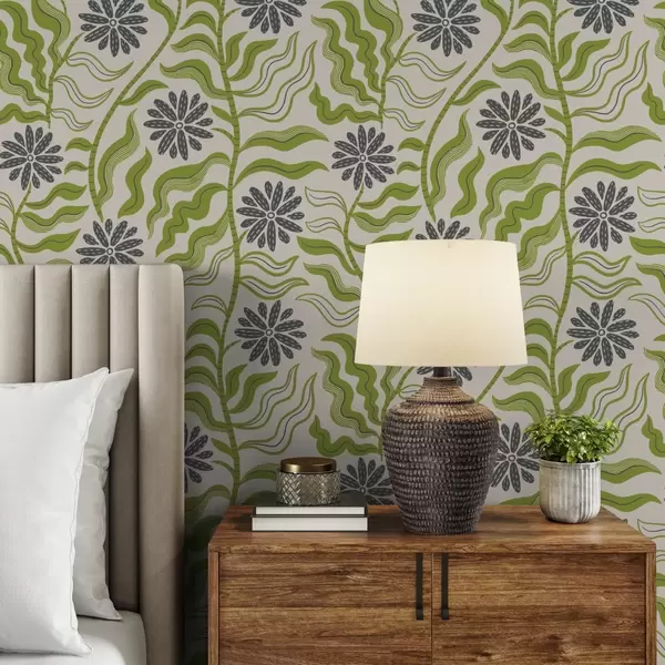 Tapet Margarete verzi jucăușe cu frunze ondulate pe un fundal crem Nr. a00998