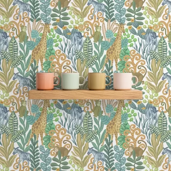 Tapet Animale vesele din savană printre frunze pe fundal alb Nr. a01000