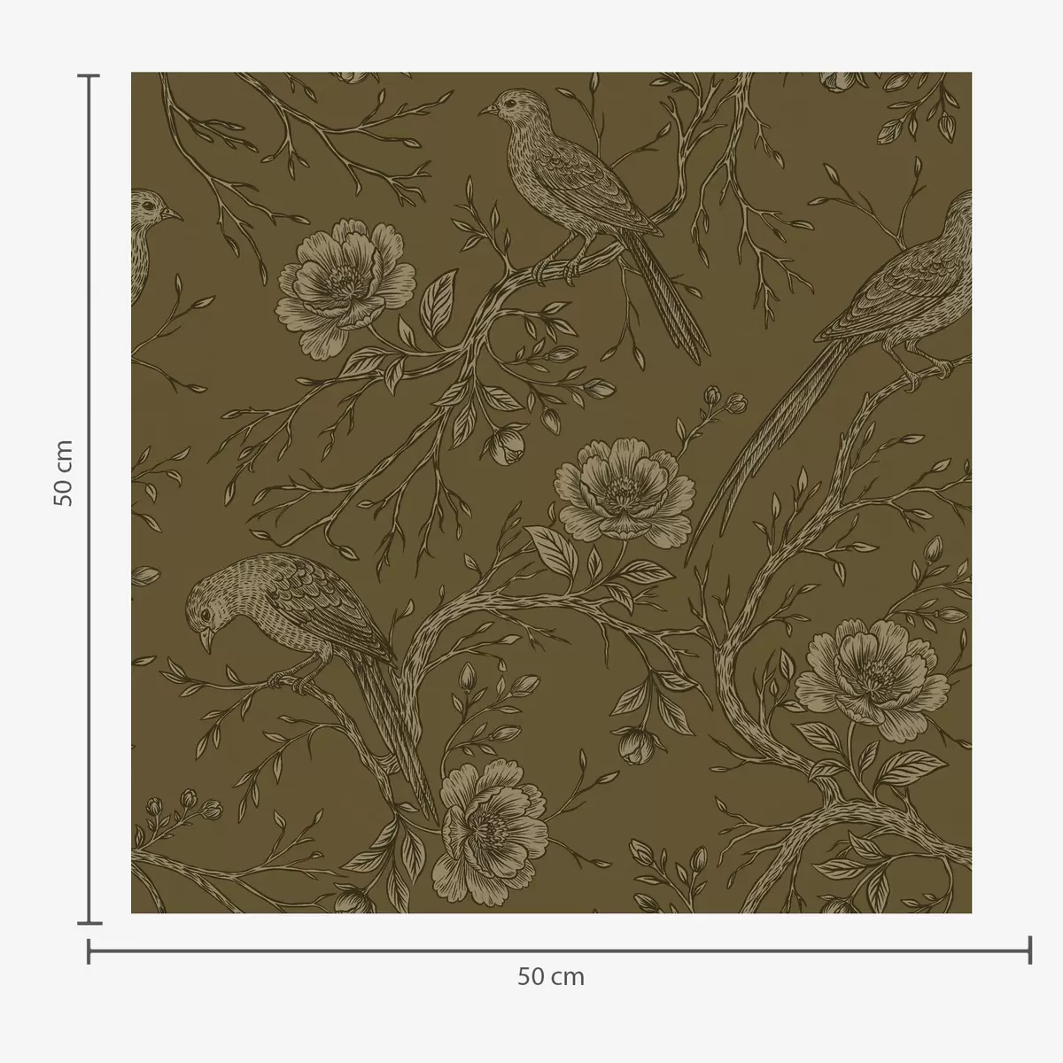 Tapet Păsări și flori vintage pe un fundal cald de culoarea măslinului Nr. a01022v1