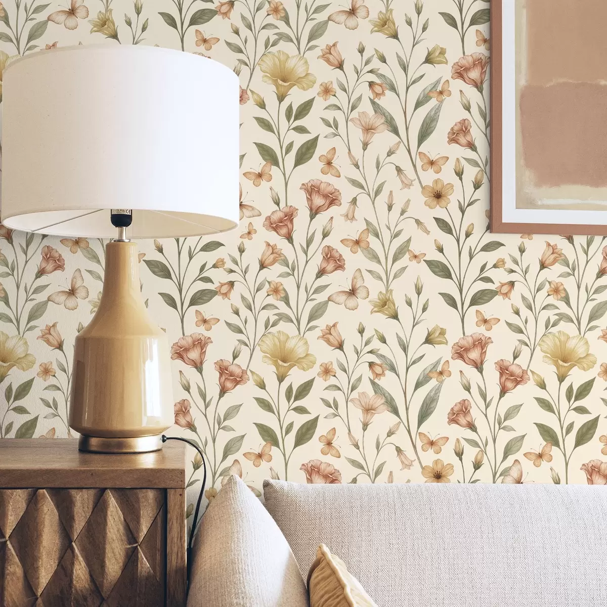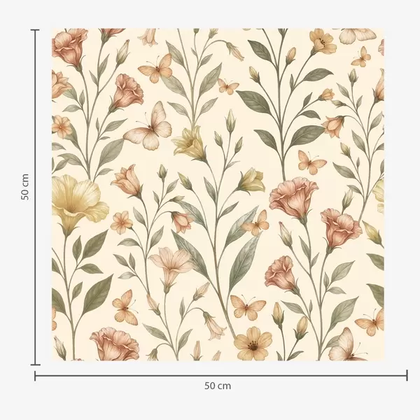 Tapet Flori delicate de piersic și fluturi pe un fundal crem cald Nr. a01026