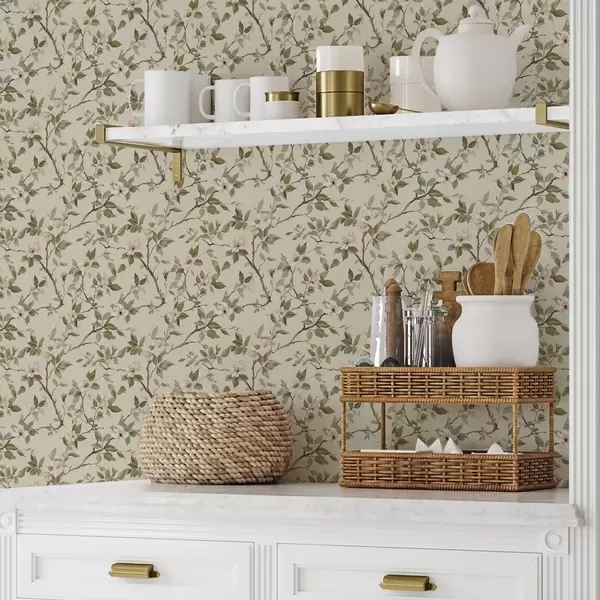 Tapet Ramuri ușoare cu flori mici de culoare crem și frunze verzi Nr. a01028