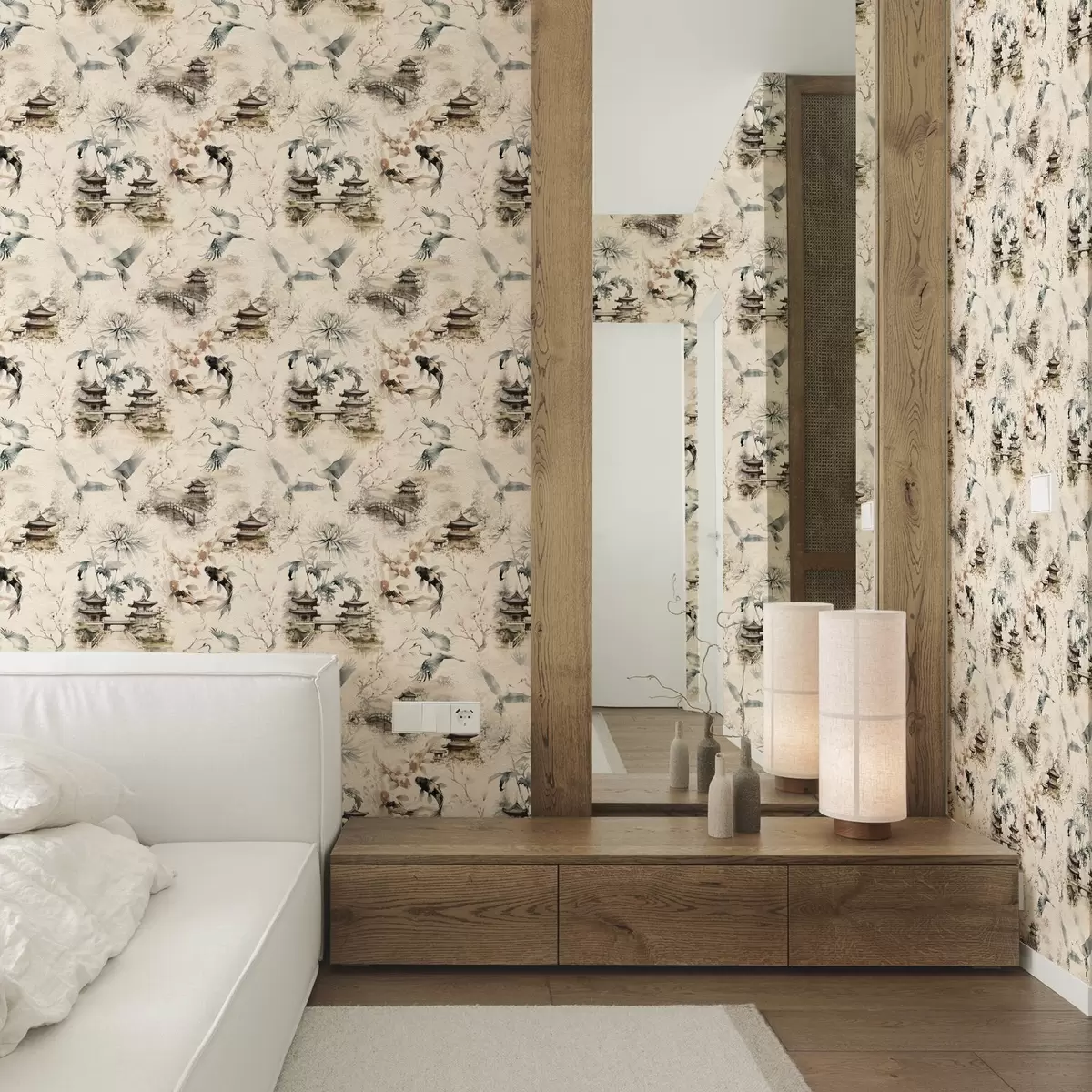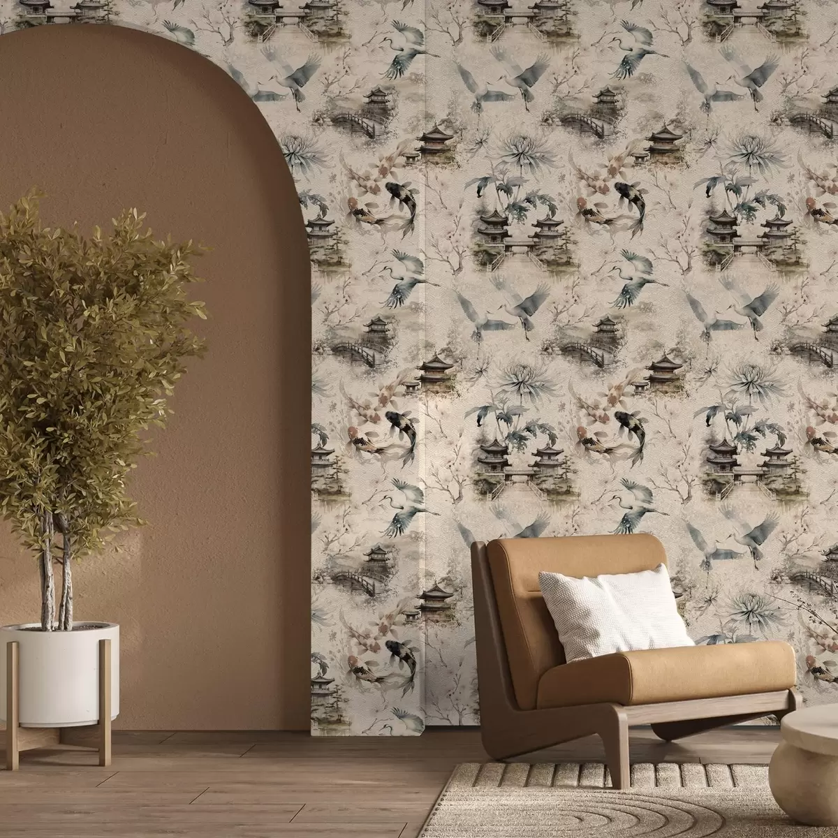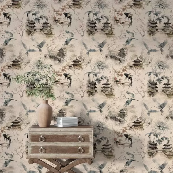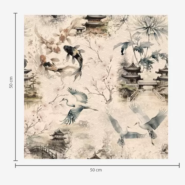 Tapet Temple japoneze, pești koi și cocori pe un fundal delicat Nr. a01040