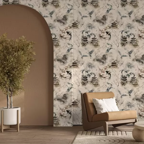 Tapet Temple japoneze, pești koi și cocori pe un fundal delicat Nr. a01040