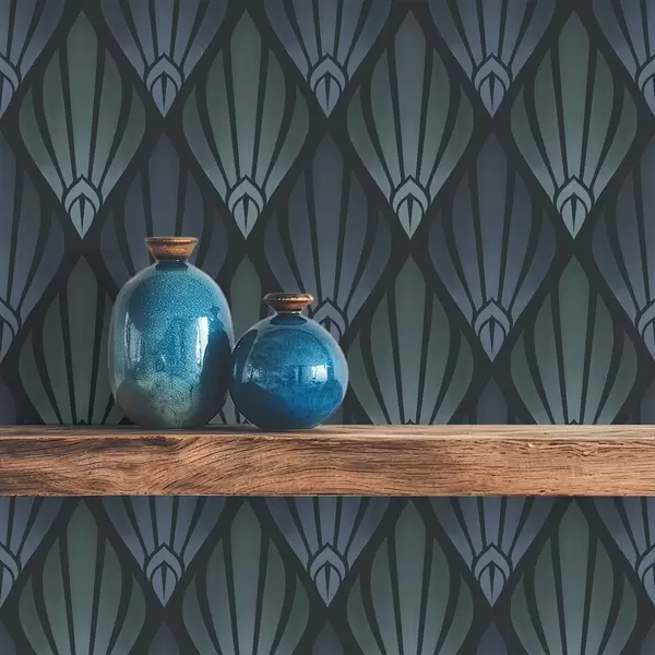 Wallpaper Art Deco albastru-gri rece, cu forme în formă de evantai a01064v3