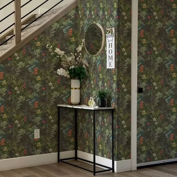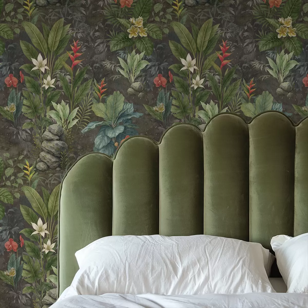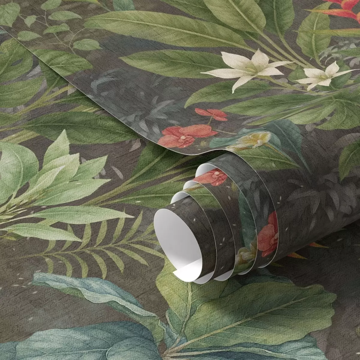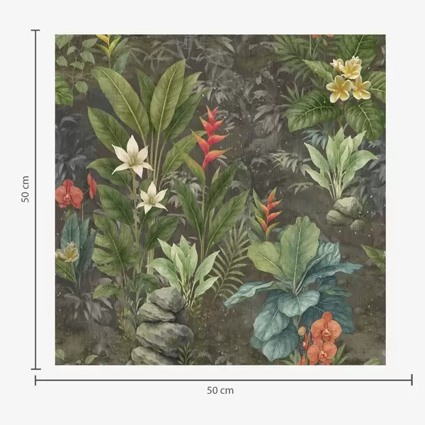 Tapet Grădină tropicală întunecată cu flori și frunziș viu colorate Nr. a01079