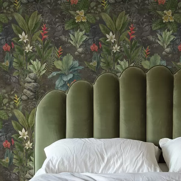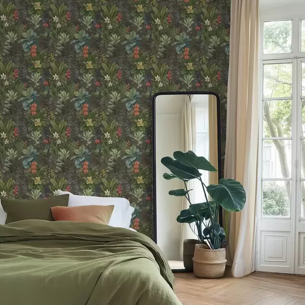 Tapet Grădină tropicală întunecată cu flori și frunziș viu colorate Nr. a01079