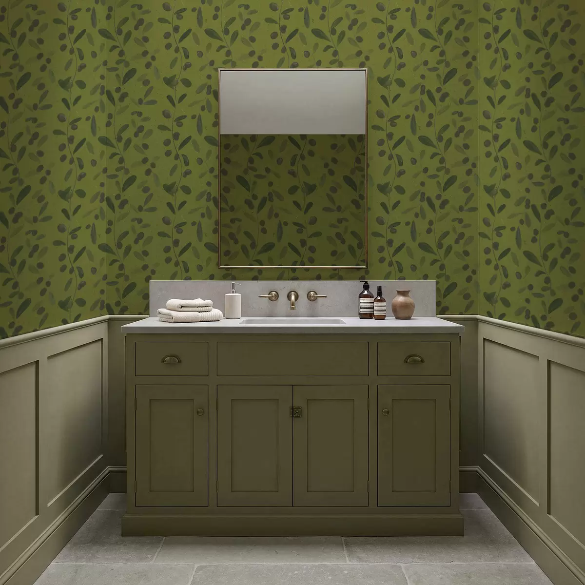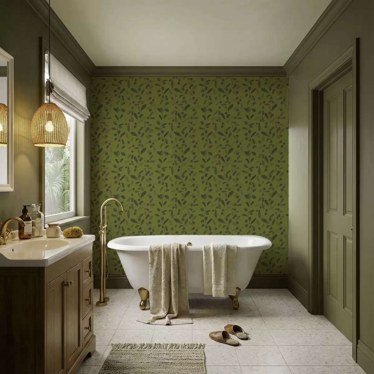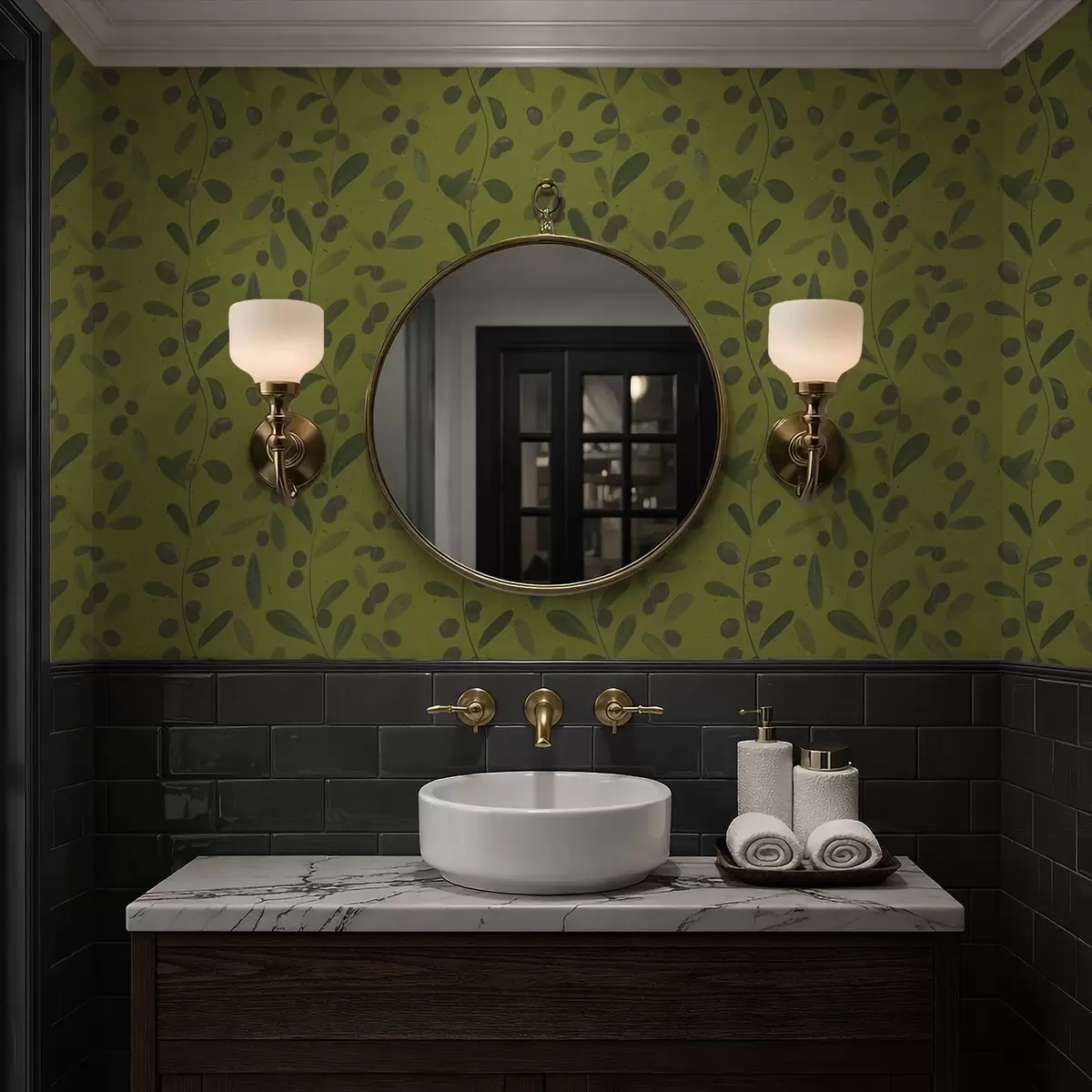 Tapet Ramuri verzi cu frunze și fructe de pădure pe măslin Nr. a01113